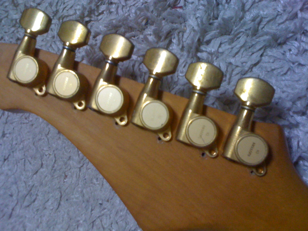 今回、新品では¥6000~もするGOTOHペグの6連ゴールドですが、オークションで古いものを¥2400でGET。千鳥LPなみに傷みもありますが、このギターが古いのでとても自然に馴染んでとっても満足。